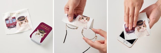 阪急電車をバックに、猫車掌さんが敬礼しているデザインのめがねふきです。猫車掌さんのイラストが入ったかわいいマルーンカラーの缶が付いています。缶は、めがねふき入れとして使ったりするほかに、小物入れとしても重宝します。めがねふきは、めがねだけでなくスマホ画面にも使えます。