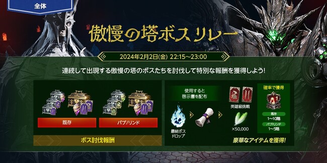 「傲慢の塔」のボス モンスターが4体出現する「傲慢の塔ボス リレー」を2月2日(金) 22時15分より開催します。