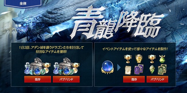 期間中、毎日11時50分と19時50分に、全てのワールドのアデン城の村で青い色のドラゴン モンスターが大量に出現します。最終ボス モンスター「青龍」を討伐時、「青龍の宝玉(イベント)」を獲得できます。