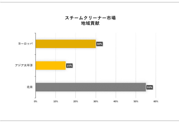 北米地域は、予測期間中に最も速い速度で成長するため、スチームクリーナーにおいて最も有利な機会を提供することが期待される地域です。2030年まで、北米の地域市場は35%の顕著なシェアで成長すると予想されています。同地域の市場成長の主な理由は、建設部門の成長であります。例えば、米国では、2022年に建設市場が6%増加すると予測されています。さらに、この地域では、スマートホームの数も増加傾向にあります。これに加え、再生可能エネルギー資源の導入に注目が集まっていることが、北米におけるスチームクリーナーの市場成長に寄与すると考えられています。