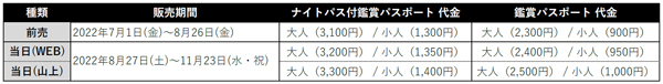[前売ナイトパス付鑑賞パスポート]大人(中学生以上)3,100円、小児(4歳〜小学生)1,300円