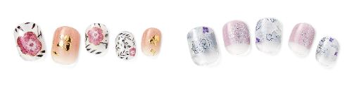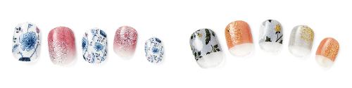 アンティークフラワー柄にほんのり色付くピンクやコーラルカラーを取り入れたネイルシールです。花柄でも甘すぎず、きらっと輝く箔で大人っぽく上品な印象に仕上がります。デザインは左から、〈おどる花々〉〈風そよぐ午後〉〈たおやかな花々〉〈舞い上がる花〉の4種類です。