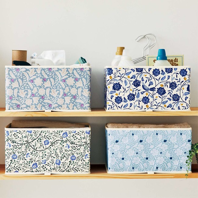 ブルーテイストのアンティークフラワー柄が落ち着いた印象の収納ボックスです。