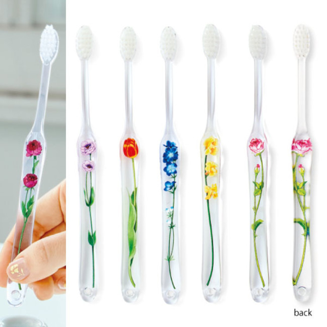 デザインは、写真左から〈シャクヤク〉〈トルコキキョウ〉〈チューリップ〉〈ディルフィニウム〉〈スイートピー〉〈バラ〉の6種類です。両面プリントなので、どこから見ても美しい仕上がりです。ブラシのヘッドは22穴の高密度植毛でしっかりブラッシングできます。