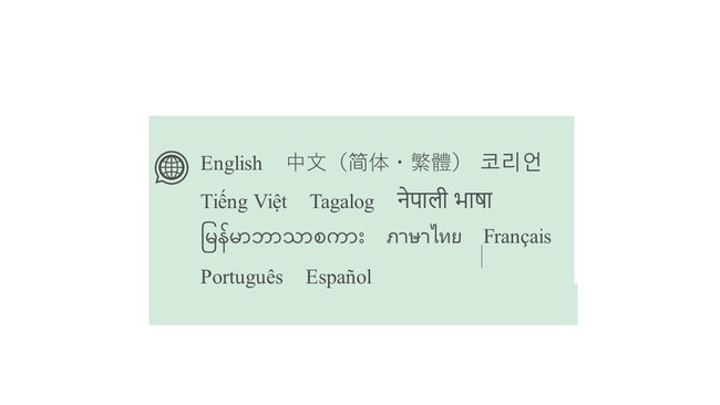 対応言語は、英語、中国語(簡体字・繁体字)、韓国語、ベトナム語、タガログ語、ネパール語、ミャンマー語、タイ語、フランス語、ポルトガル語、スペイン語です。