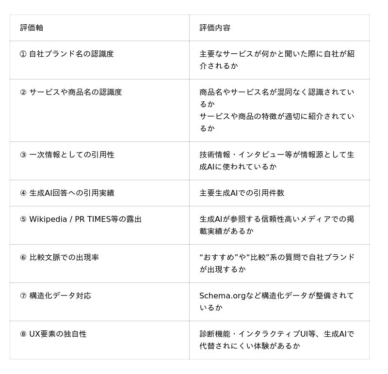 生成AI(ChatGPT、Perplexity、Geminiなど)上で自社またはクライアントブランドがどれだけ認知・引用されているかを測定し、SEOとは異なる新たなファインダビリティ(見つけられやすさ)指標としてLLMOスコアを導入・活用するための採点ガイドラインとする。