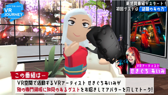 株式会社クリーク・アンド・リバー社(C&R社)に所属するVR/NFTアーティスト・せきぐちあいみと教育やアート、ゲームなどVRと親和性のある領域に知見を持つゲストが、VR空間で対談するコンテンツ『せきぐちあいみのVR JOURNEY』が、8月30日(火)よりスタートいたしました。