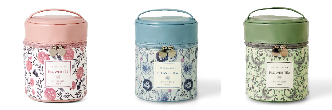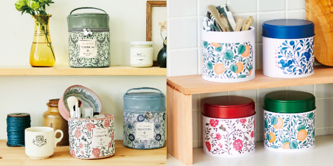 眺めのいい暮らしを演出するアンティークフラワー柄の「紅茶缶みたいなバニティポーチ」と「並べるだけで華やか 缶入りフレーバーティー」がフェリシモ「am&be[アンビィ]」から新登場