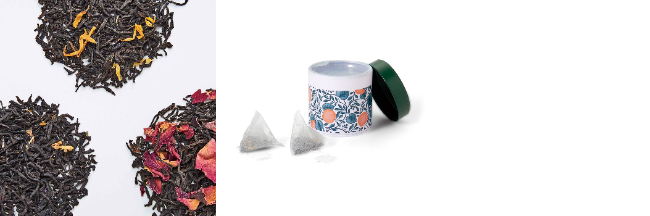 紅茶葉にフルーツや花びらをブレンドした、それぞれの缶の柄をイメージしたフレーバーティーです。テトラティーバッグがひと缶に17個入っています。