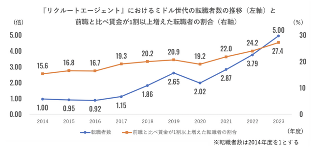 株式会社リクルート(本社:東京都千代田区、代表取締役社長:北村 吉弘、以下リクルート)は、ミドル世代(※1)の転職時の賃金や転職事例についてまとめましたので、ご報告します。賃金については、四半期に一度発表している「転職時の賃金変動状況」(※2)を分析し、ミドル世代における「前職と比べ賃金が明確に(1割以上)増加した転職者数の割合」の経年変化をまとめました。また、直近のミドル世代の転職事例を通じ、特徴や背景をご紹介します。