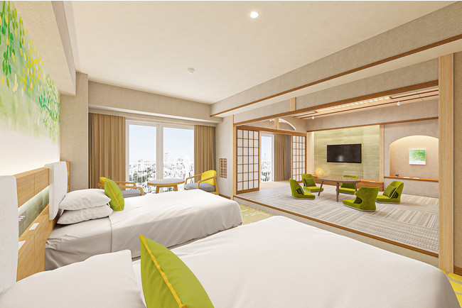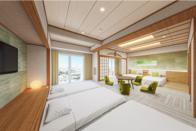 客室タイプは2〜3名様のスタンダードルームのほかに、ベッドを4台備えたファミリーやグループ向けの広めのお部屋もご用意しております。さらに同フロアの和洋室も淡いグリーンとブラウンの色調で統一し、琉球畳を使用したスタイリッシュな客室にリニューアルしました。