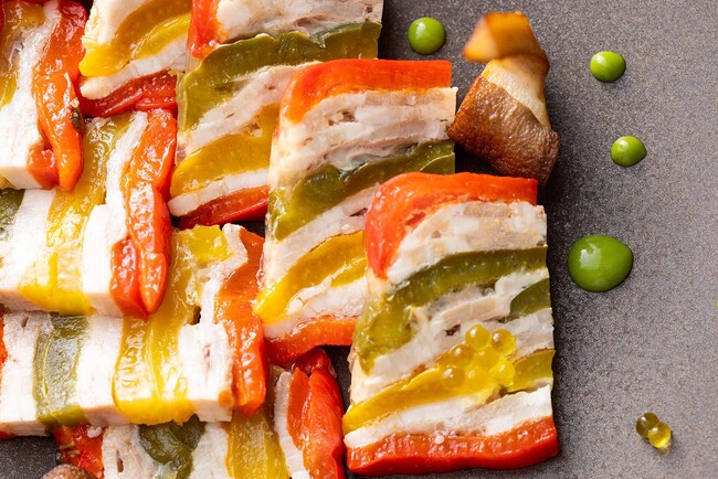伊達の純粋赤豚と焼きパプリカのプレッセ もっこりニラのソース