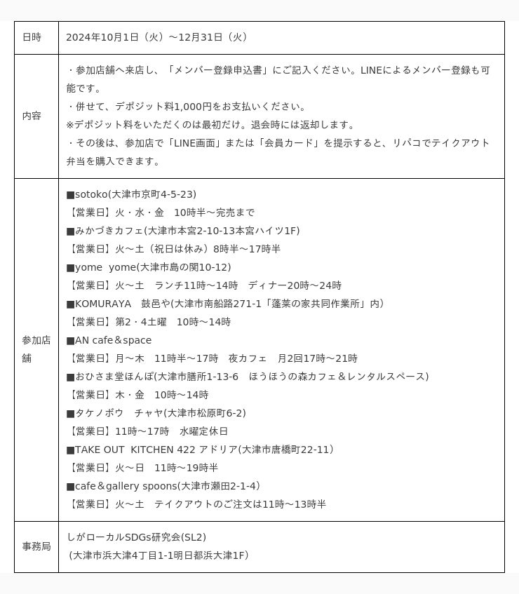 一方で、小規模の3店舗のみの実証実験ということで、地域共通リユース容器という性質を活かしきれていない状況もあり、今回、大津市内の9店舗に拡大して実施します。リユース容器「リパコ」の参加店舗が増え、その店舗を応援する利用者が増えることが、プラスチック容器を減らし、利用者にプラスチック問題への取り組みの一歩にしてもらうことを目指します。