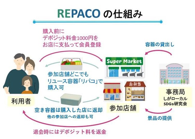 一般社団法人海と日本プロジェクトin滋賀県は、地域の人々が身近なところからプラスチックごみを減らすことができる取り組みとして、テイクアウト弁当を購入する人が地域共通リユース容器「リパコ」をシェアできるサービスの社会実験の参加店舗を9店舗に拡充させ実施します。テイクアウト弁当は使い捨てプラスチック容器を用いられることが多く、独自に行った事前調査では7割以上の人が、「使い捨て容器を捨てるときに罪悪感を感じたことがある」と回答しています。リパコを使用することで毎日の昼食時に出ていた使い捨て容器のごみが削減され(1回の利用でプラスチックごみが約25g、CO2を約132g削減することができます)、合わせてプラスチックごみ問題の理解を促進するとともに、持続可能なサービス提供方法について探ります。