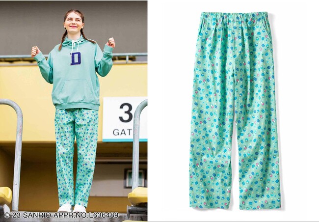やさしいペパーミントグリーンに、ゴロピカドンとラジカセの総柄がとってもキュートなパンツです。ウエストは総ゴム仕様、タックの入ったゆったりめのストレートシルエットです。洋服としては珍しいカラーで、おしゃれな着こなしにチャレンジしたくなるアイテムです。