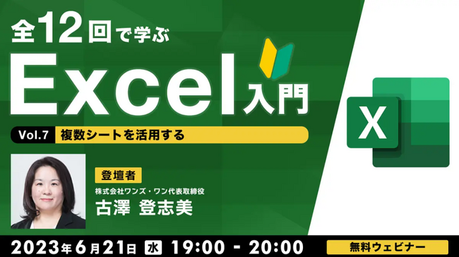 第7回となる今回のテーマは「複数シートを活用する」です。PC&IT講師として20年以上の経歴を持つ株式会社ワンズ・ワン代表取締役の古澤 登志美氏にご登壇いただき、シートのコピーやグループ化、シート間の連携など、Excelの便利な機能のひとつ「シート」の活用方法についてわかりやすく解説していただきます。この機会に、Excelの機能の正しい実行方法や簡単に結果を表示する方法、作業効率をアップさせる方法など、改めて学んでみませんか?