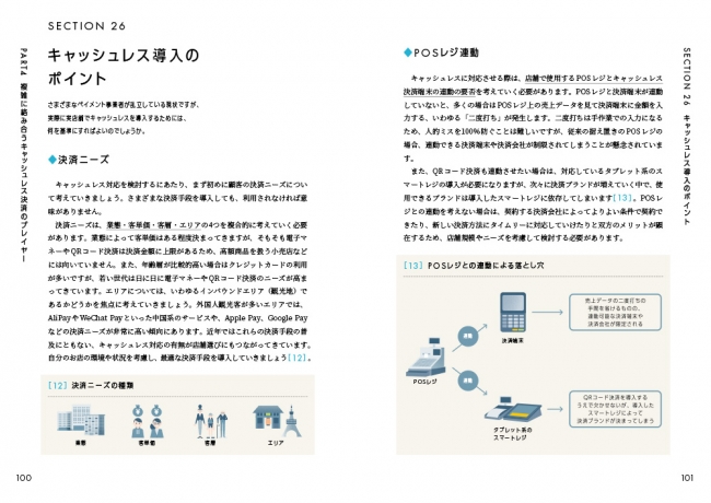 キャッシュレス決済を支える技術や、キャッシュレス決済を推進する意図、市場にひしめく多様なプレイヤー、インバウンド対応でのメリットや店舗が導入する際のポイント、さらには海外で誕生している新たなサービス、購買データの活用など、さまざまな構想が入り組むキャッシュレス決済の全体像を、図をふんだんに用いてわかりやすく解説しました。