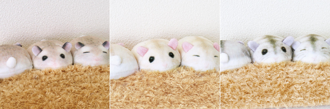 3種類の大きさにもこだわっています。実際のロボロフスキーハムスター(左下)は小さいハム種なので、少し小さめサイズに設定しています。