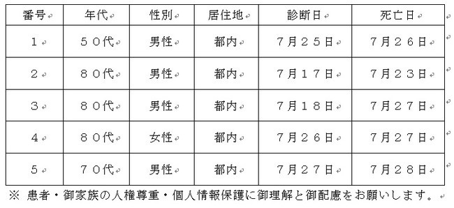 都内で新型コロナウイルスに感染した方が死亡されましたのでお知らせします。