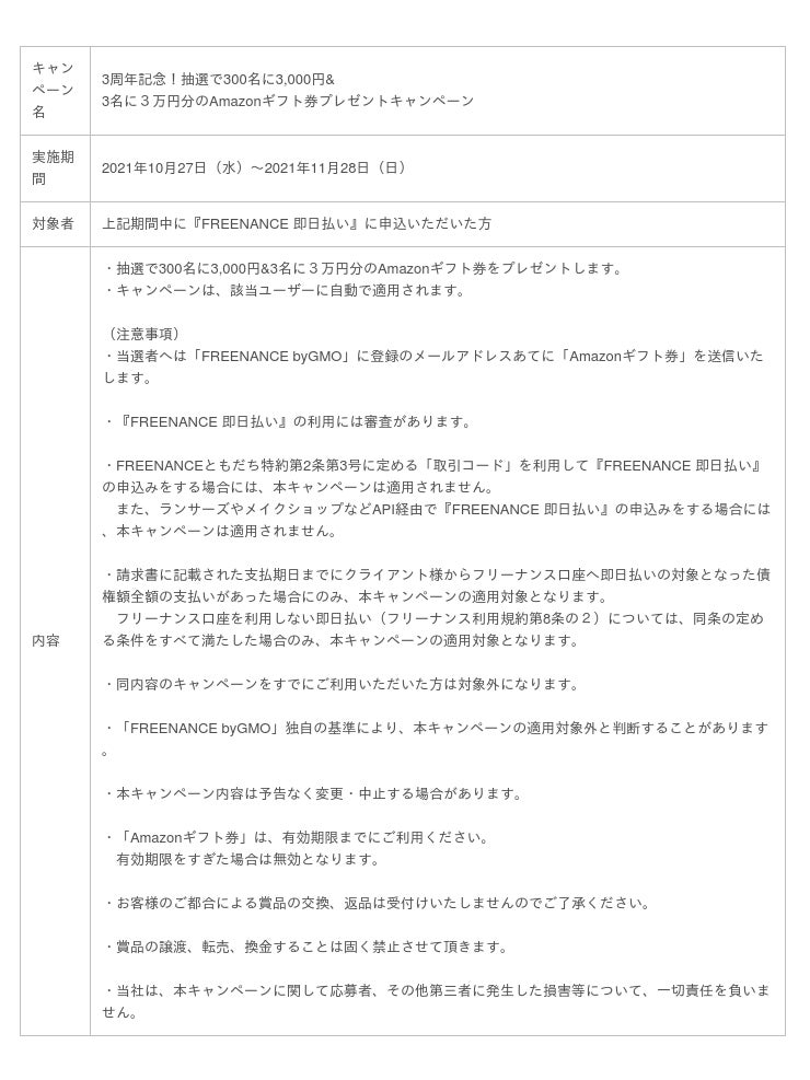 これを記念して、請求書(売掛債権)をすぐに現金化できるファクタリングサービス『FREENANCE 即日払い』にお申し込みいただいた方を対象に、本日2021年10月27日(水)から11月28日(日)までの期間、抽選で300名に3,000円、3名に3万円分のAmazonギフト券をプレゼントするキャンペーンを実施します。