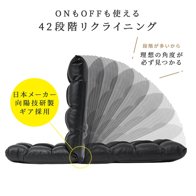 背もたれを倒せるリクライニング機能付きです。リクライニングのギアは日本メーカー向陽技研製42段階ギアを採用しており、細やかな角度調節を可能にしています。
