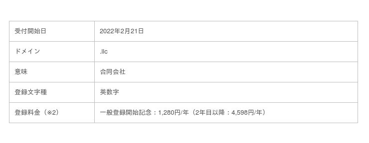 (※2)2022年2月21日(月)時点の初年度の税込価格です。最新の初年度登録料金は「.llc」の登録ページをご参照ください。