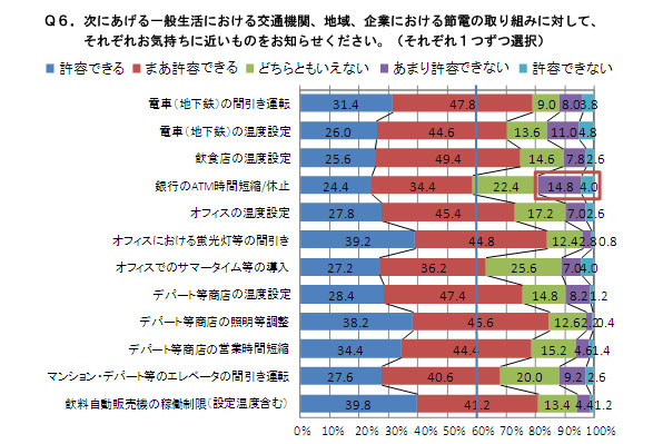 今回提示した節電対策の中で、唯一許容できるという回答が6割を下回ったのは、「銀行のATM時間短縮/休止」であった。