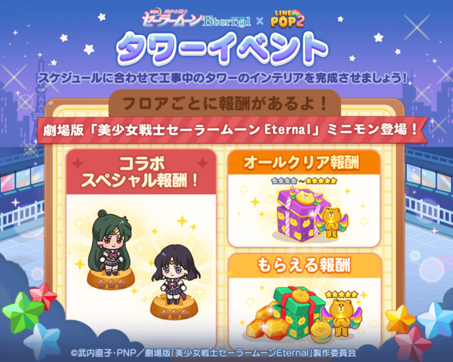 本コラボを記念した期間限定のPOP2タワーが出現します。フロアごとに「★3スーパーセーラーサターン/土萠ほたる」や「★3 スーパーセーラープルート/冥王せつな」など、さまざまな報酬が用意されています。
