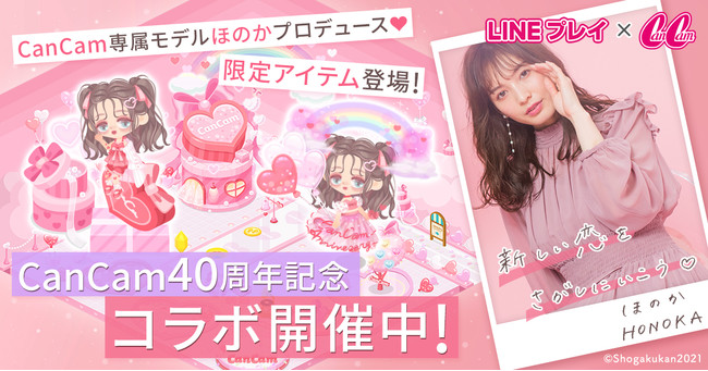 本コラボレーションでは、「LINE プレイ」に人気女性ファッション誌『CanCam』(小学館発行)の創刊40周年を記念した公式ガーデンがオープンします。CanCam専属モデルのほのかさんとコラボレーションした、ピンクのリボンやハート、フリルなどをあしらった「恋するアイテム」がガチャに登場するほか、メイクシリーズも登場します。