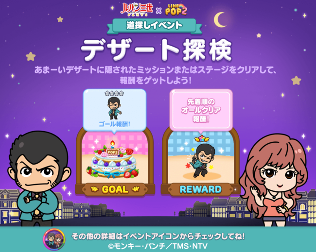 ミッションをクリアし、報酬を獲得しながら次の道へ進んでいく道探しイベントに『ルパン三世 PART6』のキャラクターたちが登場します。ルパン三世たちにお菓子をプレゼントしてゴールを目指しましょう。ゴール報酬として「★6 ルパン三世」をはじめ、豪華報酬がもらえます。
