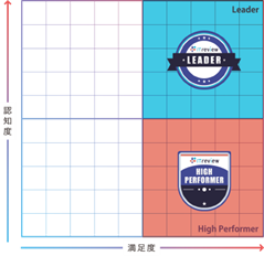 ITreview Gridでユーザー評価の高い2領域を表彰し、上の領域のプロダクトにはLeader バッジを発行。下の領域のプロダクトにはHigh performerバッジを発行しています。