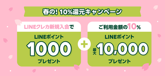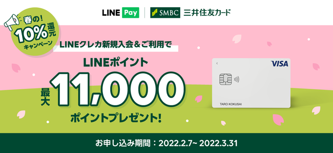 LINE Pay株式会社(本社:東京都品川区、代表取締役社長CEO:前田 貴司)は、2022年2月7日(月)から2022年3月31日(木)まで、Visa LINE Payクレジットカード(以下、LINEクレカ)の新規入会とLINEクレカのご利用で、最大LINEポイント11,000ポイントをプレゼントする「春の!10%還元キャンペーン」を開催いたします。
