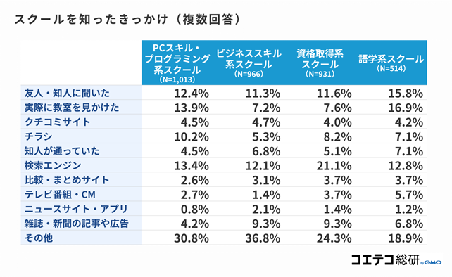各スクールにより多少の違いはあるものの、「クチコミサイト」「比較・まとめサイト」の割合も10%〜16%台となっています。全体的には、公式サイトを筆頭にインターネット上の情報をスクール選びの参考にしている人の割合が多いことがわかりました。