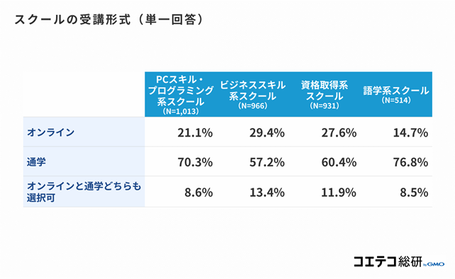 次に、スクールの受講形式についても調査しました。オンラインによる受講が最も多かったのは、ビジネススキル系スクール(29.4%)となっており、「オンライン/通学どちらでも選べる」も含めると、42.8%と4割を超える結果となりました。一方で、語学系スクール(14.7%)は一番低く、ビジネススキル系スクールと10pt以上の開きがある結果となっています。