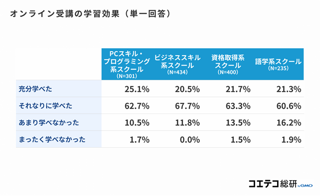 さらに、オンライン受講の学習効果については全てのスクールにおいて「充分学べた」「それなりに学べた」を合計すると80%以上となり、大多数の方が満足していることがわかりました。