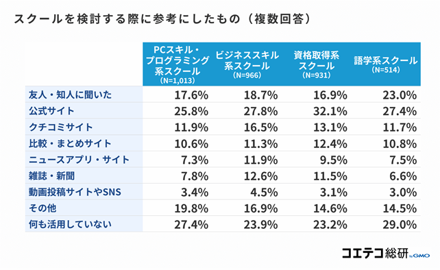 次に「スクールを検討する際に参考にしたもの」を調査しました。「公式サイト」を参考にした人の割合が多く、中でも資格取得系スクールが32.1%と最も多く、ビジネススキル系スクール(27.8%)、語学系スクール(27.4%)、PCスキル・プログラミング系スクール(25.8%)と全スクールで4分の1以上が「公式サイト」を参考にしていることがわかりました。