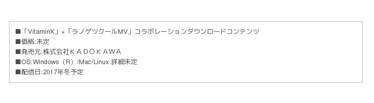 株式会社KADOKAWA(本社:東京都千代田区、代表取締役社長:松原眞樹)は、2017年冬発売予定のアドベンチャーやライトノベルゲームを制作できるゲームコンストラクションツール「ラノゲツクールMV」と、株式会社ディースリー・パブリッシャー(本社:東京都渋谷区、代表取締役社長:灘 俊宏)から発売中の「VitaminX」とのコラボレーションダウンロードコンテンツ(以下コラボレーションDLC)の内容を公開しました。
