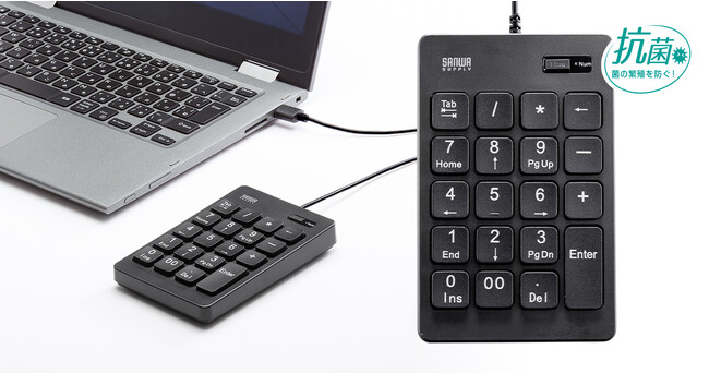 テンキーの材質に抗菌剤を練り込んでおり、抗菌作用で菌の繁殖を抑えます。