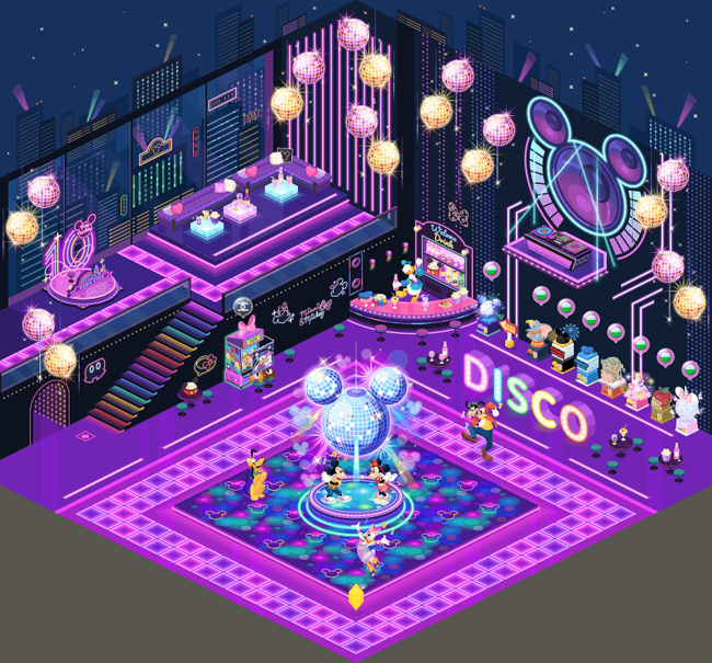 今回オープンする「ディズニー ディスコ」スクエアは、みんなでミラーボールを囲んで踊ったり、ローラスケートをしたりとアバター同士のコミュニケーションが楽しめるほか、スクエア内にあるリズムゲームで、5,000ポイントを達成するごとにスペシャルアイテムがもらえるイベントやミッションをクリアするとマジックアイテムやポスターアイテムなど、豪華アイテムがもらえるコレクションブックイベントを開催いたします。