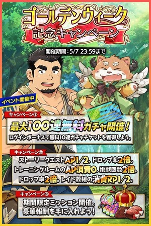 期間中にログインすると最大100連分引ける無料ガチャや、ストーリークエストとトレーニングルームの消費AP減(トレーニングルームはなんと消費AP0!)&ドロップ率2倍、レイド救援のRP消費1/2、さらに豪華アイテムが手に入る期間限定ミッションなど盛りだくさん!