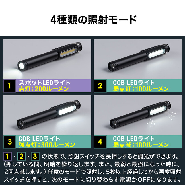 ペン型LEDライト USB充電式 LED懐中電灯 マグネット内蔵クリップ 防水規格IP54 最大300ルーメン