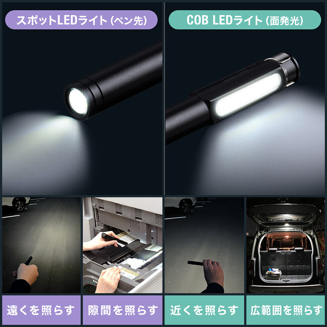 また、ペン先はスポットLEDライトを搭載し、暗い隙間や遠くを照らすのに最適です。