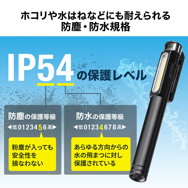 本製品は、USBポートで充電できる、IP54の防水・防塵規格相当のペン型LEDライトです。