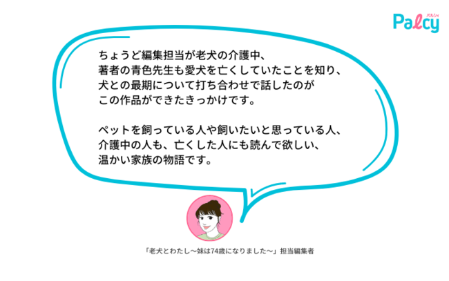 『老犬とわたし〜妹は74歳になりました〜』は少女・女性マンガアプリPalcyにて連載され、毎週日曜日に更新予定。