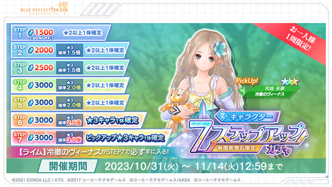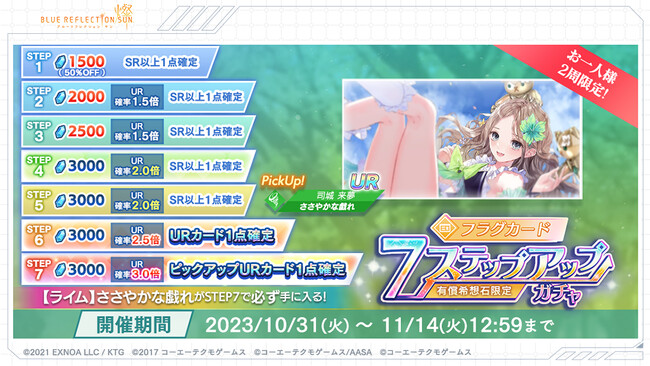 有償希想石で10連ガチャを引くごとにSTEPが1つアップ!STEP7では、それぞれのガチャで★3キャラクター/URフラグカードの出現確率が3倍になるほか、ピックアップ★3キャラクター1体/URフラグカード1枚が確定でゲットできます!