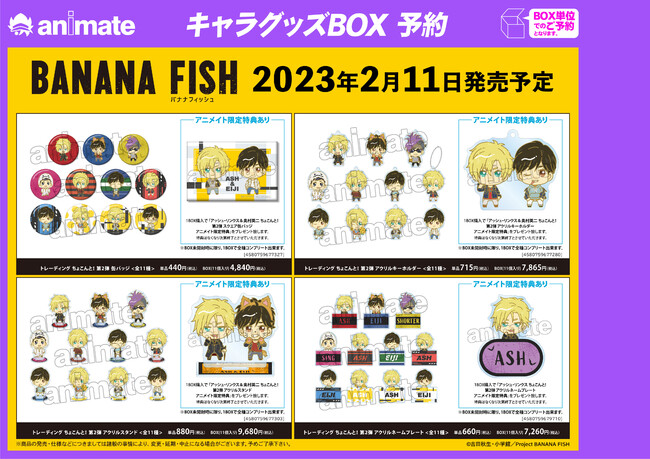 2023年2月11日(土)〜2023年2月26日(日)のイベント開催期間中、全国アニメイトにてTVアニメ『BANANA FISH』関連のキャラクターグッズをご購入2,200円(税込)毎に、購入キャンペーン限定「ポストカード(全8種)」をランダムで1枚プレゼント!