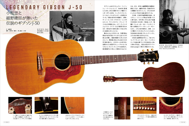 さらに、小坂忠の追悼記事では、生前に使用していたお気に入りのギターを6本紹介しています。そのうちの1本で、細野晴臣『HOSONO HOUSE』でも使用されたというギブソンJ-50の詳細も紹介しています。
