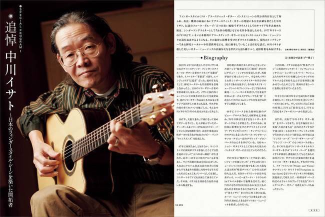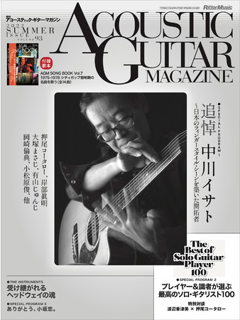 今号のアコースティック・ギター・マガジンは、フィンガースタイル(ソロ・アコースティック・ギター・インスト)シーンの草分け的存在として知られ、奏法・機材の両面においてアコースティック・ギターの発展に多大な貢献を果たした中川イサトの追悼特集、約70名のプレイヤー&識者が選んだアンケート企画“最高のソロ・ギタリスト100”など、まさにソロ・ギターづくしの一冊です。