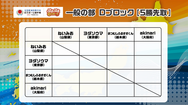 本大会は「小学生の部」「一般の部」それぞれ、出場選手をA・B・C・Dの4つのブロックに分け、ブロックごとにリーグ戦を行い、各ブロック上位1名が決勝トーナメントに進出します。決勝トーナメントはシングルイリミネーション方式で行われ、1回戦の組み合わせはAブロックの1位・Bブロックの1位、Cブロックの1位・Dブロックの1位となります。そして決勝トーナメントで1位となった選手がぷよぷよの日本一「全国都道府県対抗eスポーツ選手権 2022 TOCHIGI ぷよぷよ部門」の優勝選手となります。