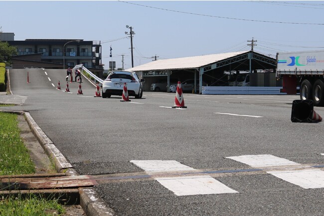 JAF福岡支部では、県内の受講者に対して一層の注意喚起のため、実技講習を通じてドライバー自身の運転技量とクルマの特性・限界について理解を促します。安全な交差点の通過方法「多段階停止」のほか、「スラローム走行」「急ブレーキ」など、公道ではできない走行を体験していただくことで、普段の運転行動の振り返りをおこなうものです。